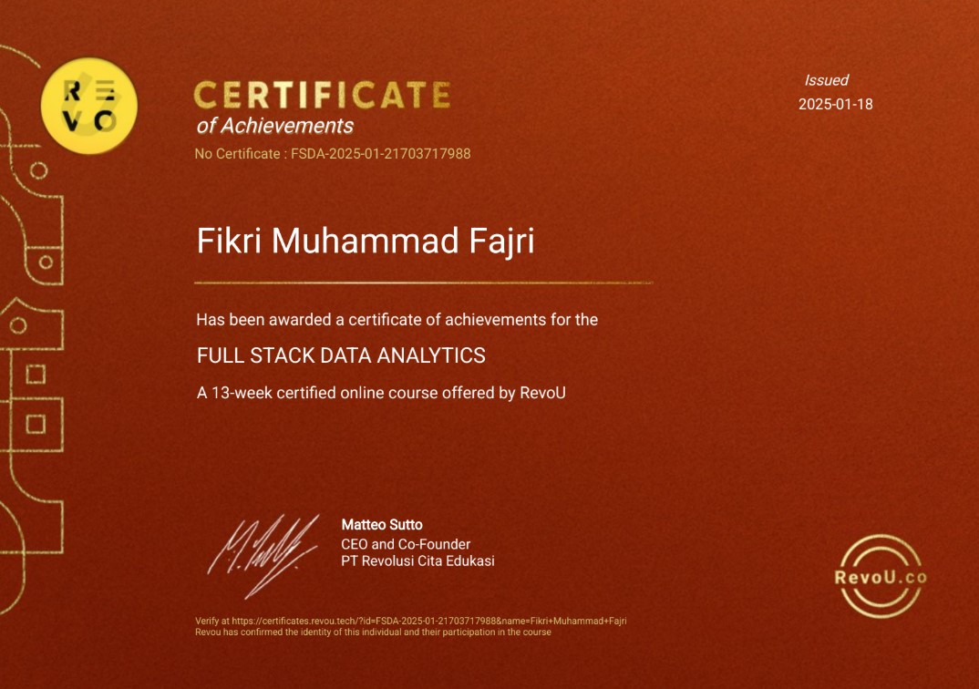 I am a data-driven and detail-oriented Informatics graduate from Telkom University with hands-on experience in analytics across healthcare, finance, and e-commerce domains. My strong foundation in data analysis, gained from both academic and real-world projects, enables me to deliver impactful insights and recommendations.During my recent roles as a Data Analyst Associate at RevoU in collaboration with Hasna Medika and RevoFin, I developed and presented interactive dashboards, performed cohort and clustering analysis, and provided strategic insights for HR, medical services, and risk evaluation. These roles honed my skills in SQL, Python, and Power BI, as well as sharpened my ability to connect data insights with business objectives.With a combination of technical skills, strong analytical thinking, and a collaborative mindset, I am ready to contribute to data-driven decision-making, operational efficiency, and business growth.